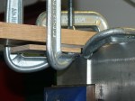 The final exercise for today was to make the angles that attache to the horizontal stabilizer rear spar. These required a bend with an inside radius of 1/8" tangent to the inside radius of the angle. To bend this I found a screw driver shaft that was the correct diameter and clamed the angle to a plate in the vice. Next I attached a piece of hardwood to provide the leverage for the bend. This seem to work okay but it did cause the angle to bend a little on the adjacent leg. I solve this problem with a few blows from my rubber mallet after the initial bending.