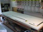 After drilling all of the pilot holes in the lower left skin I started on the upper left skin. First I identified that the plans show the inside view of the left skin. I unrolled 3 sheets and then rolled two back up. Next I determined which would be the inside. I was fortunate that the side that had some small scratches was also the side with the labeling so it was easy to decide to use this as the inside. Next I did my rough layout so that I could cut out the smaller sheet to work with. After trimming the sheet I started to layout the finished dimensions by first drawing the leading edge and the working on the outboard edge.