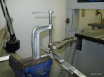 Today I continued working on installing the nut plates in the wing tip angles. One of the tricky tasks was to dimple the angles for the countersunk rivets and the countersunk screws I would be using. I have a hand squeezer and dimple dies but due to the sharp bend in the angles (approximately 45 degrees) the squeezer would not work. I decided to try using a regular c-clamp as a squeezer with the bottom die being the countersunk spacer and then use the top dimple die to push the counter sink down into the spacer. I removed the swivel from the threaded portion of the c-clamp and then removed the threaded piece from the c frame. Next, I used a long drill to drill out a 1/8 inch hole in the foot of the c-clamp. I kept the hole towards the outside of the c-clamp so that I would be able to get quite close the the bend in the angle. With the c-clamp modified I was able to start the dimpling operation. I used a small 1/4 inch socket as a spacer around the post of the dimple die so that I was exerting a force on the larger part of the die. This process worked well and I was also able to dimple the larger hole for the #6 screw. This dimple wasn’t really deep enough but installing the screw finished the dimple. I managed to get three angles almost complete. I have one nut plate to install in the third angle and then the last angle to finish. Tonight I finished the third angle and started on the last one.