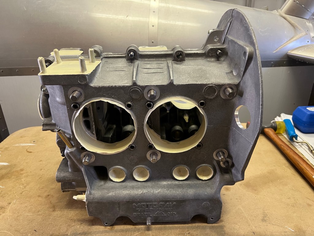 Next I proceeded to mask the cylinders with the pistons inside as shown in the AeroConversions assembly video. After getting the cylinders prepared I realized I would need different paint for these compared to the engine case. For the case, I just used a flat black enamel. The case should not exceed 400F. I had read in Bob Hoover’s blog (https://bobhooversblog.blogspot.com/2006/11/vw-case-paint.html) (https://bobhooversblog.blogspot.com/2006/11/vw-case-paint.html) that the cas should be fine painted in an oil based enamel.