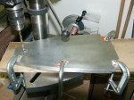 I worked on the forming template for the nose rib. The template that I made in AutoCAD was glued to a piece of MDF. Next a second piece of MDF was cut out and clamped to the first one. I drilled the tooling holes and counter sunk them. The two pieces were then bolted together and the finished shape was cut on the bandsaw. I used the bench sander to finish the parts. Next I seperated the two pieces and used a router to put a round edge on one of the pieces. The band saw as set to 10 degrees and a fence installed. I then cut the forming block to provide a 10 degree relief to allow forming to the full 90 degrees. Finally, I transferred the flute positions from the plans to the forming block and then, using the drill press and a rasp bit, I cut the flute locations into the blocks.